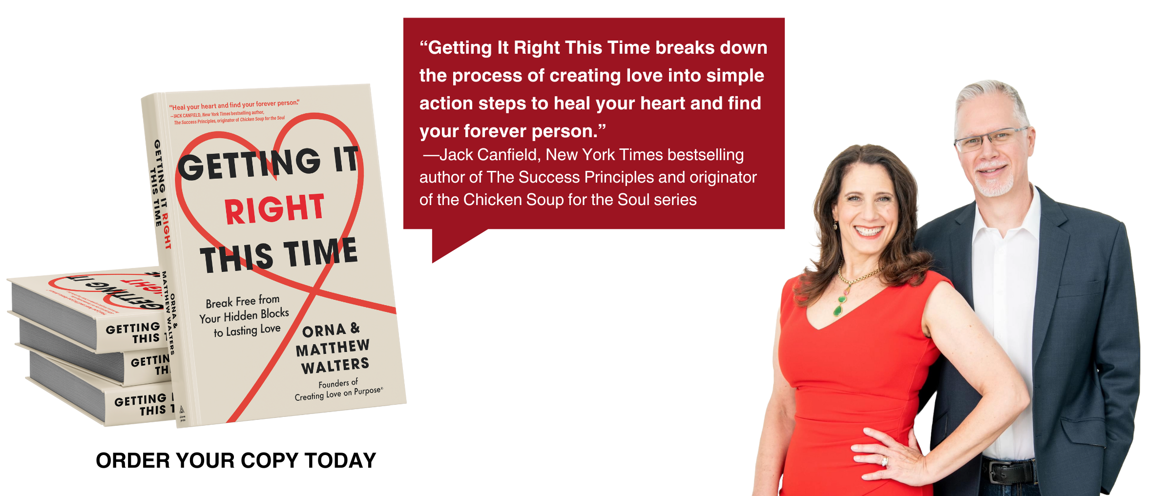 “The romantic myths that we’ve been fed for generations have created unrealistic expectations for finding love. In Getting It Right This Time, my long-time colleagues Orna and Matthew Walters break through those myths and give you common sense tools to transform unhealthy love patterns and finally get love right.”